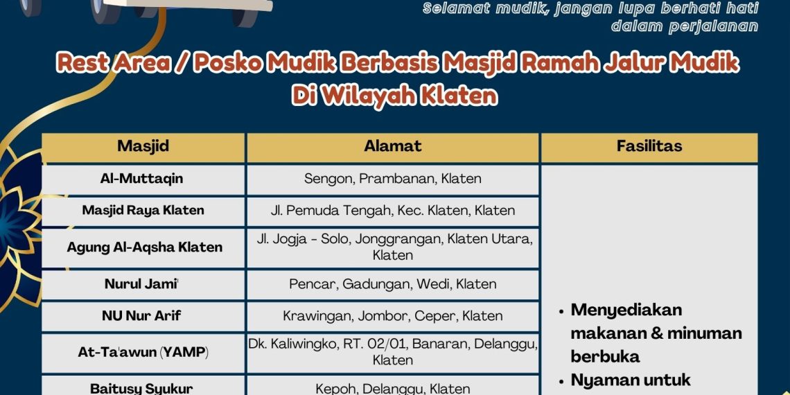 Menjelang arus mudik Idulfitri 1446 H, 15 Masjid Ramah di jalur mudik di Kabupaten Klaten siap memberikan pelayanan terbaik bagi para musafir atau pemudik yang hendak pulang kampung. Hal ini sejalan dengan Surat Edaran (SE) Nomor 2 Tahun 2025 tentang Panduan Penyelenggaraan Ibadah Ramadan dan Hari Raya Idulfitri 1446 H/2025 M yang dikeluarkan oleh Kementerian Agama.