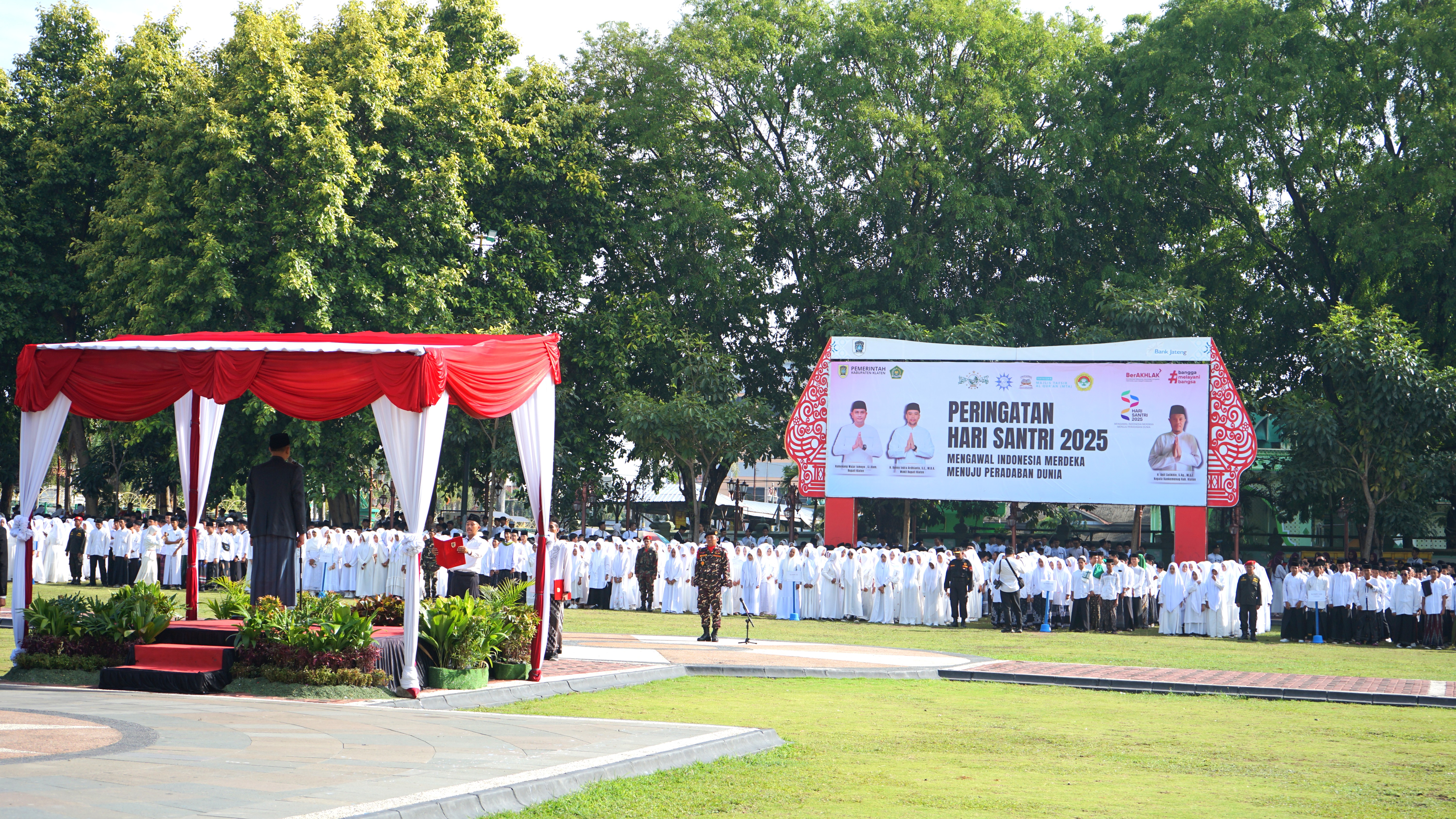 Ribuan santri dari berbagai pondok pesantren dan pendidikan keagamaan di Kabupaten Klaten memadati Alun-alun Klaten untuk mengikuti Apel Peringatan Hari Santri 2025, Rabu (22/10/2025). Kegiatan ini berlangsung khidmat dan penuh semangat kebangsaan, menandai tekad para santri untuk terus berkontribusi bagi kemajuan bangsa.